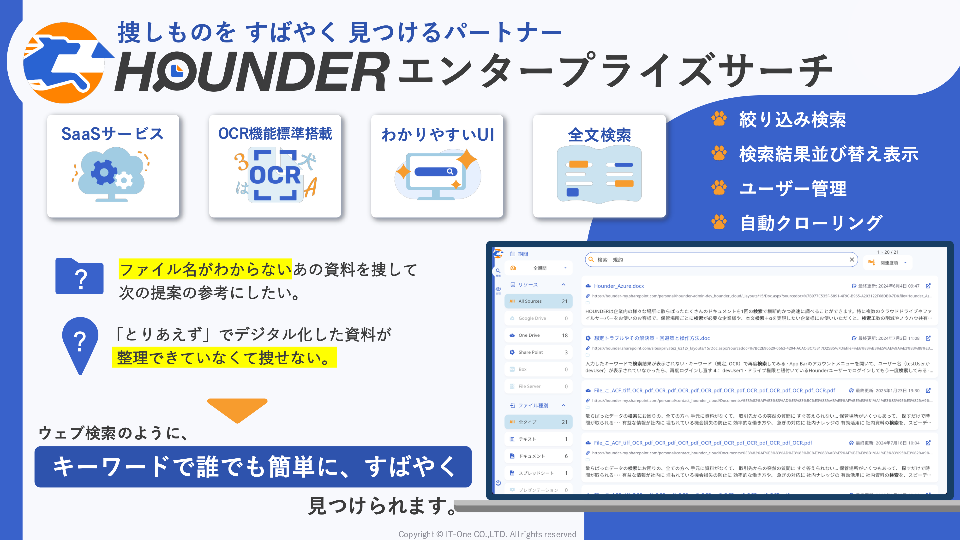 「捜しものをすばやく見つけるパートナー」として、誰でも簡単にお使いいただける企業内情報検索サービス?? シンプルな機能、わかりやすいUIで、「どこにあるか分からない!」「ファイル名を忘れた?」 そんな、情報探しの課題を解決し、業務の効率化を実現! DX推進や、業務の効率化、従業員の捜しものにかかるストレスの軽減など、快適な職場環境づくりにも。 捜しものの先にある、本来の目的に集中できる環境づくりをサポートします。 ─────────────────────────