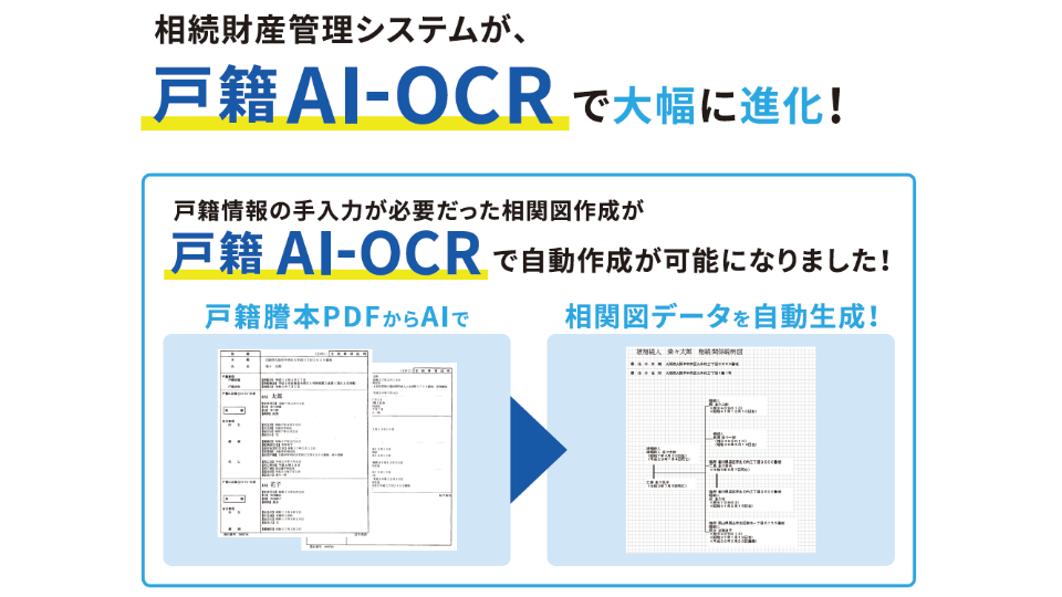 AI相続ミツローくんは、相続人特定業務を効率化するためのオンプレミスのシステムです。 ■戸籍謄本の自動解析と相続関係図の自動生成: AI-OCR技術を活用し、戸籍謄本から必要な情報を自動で抽出し、複雑な相続関係図を自動生成します。 ■業務時間の大幅な削減: 手作業で行っていた相続人特定業務の時間を大幅に短縮し、業務効率化を図ります。 ■不足戸籍の可視化: 戸籍情報の不足部分を検出し、必要な戸籍の収集をサポートします。 ■金融機関や司法書士などの専門家向けに開発: 相続業務の負担軽減を目指して開発されています。 ■情報管理の向上: 戸籍情報をデータ化することで、情報管理の向上を可能にします。 このシステムは、相続人特定業務にかかる時間と労力を大幅に削減し、専門家の業務効率化を支援することを目的としています。