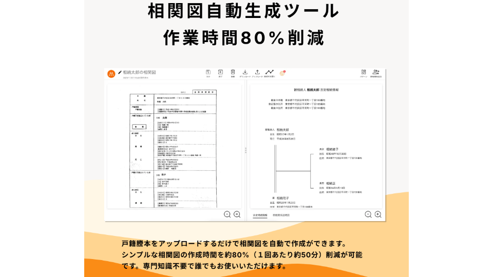 らくらく相関図は、戸籍謄本をアップロードするだけで相続関係図を自動生成するWEBシステムです。 ■戸籍謄本の自動解析: 最新のAI-OCR技術により、戸籍謄本から必要な情報を自動で抽出します。 ■相続関係図の自動生成: 抽出した情報に基づき、複雑な相続関係を可視化する相関図を自動で作成します。 ■業務時間の短縮: 手作業での相関図作成に比べ、大幅な時間短縮を実現します。 ■高い専門性不要: 専門知識がない方でも、容易に相続関係図を作成できます。 ■戸籍変遷の可視化: 戸籍の開始から終了までを時系列で表示し、変遷を分かりやすく確認できます。 ■外部システムとの連携: 外部システムと連携可能なAPIを実装しています。 このシステムは、相続関連業務の効率化を求める士業専門家や金融機関、行政機関にとって、大きな業務負担の削減に貢献するものです。