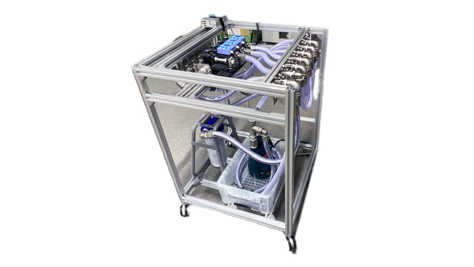 水量の流量調整を体験できるデモ機です。 装置の冷却に必要な水量(装置に流したい水量)を手動バルブで制御します。